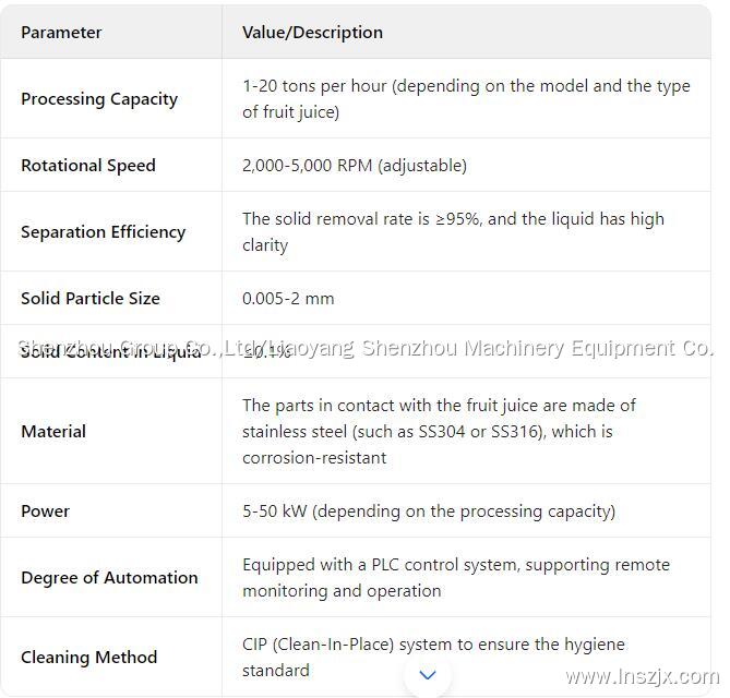 A seguir estão os parâmetros técnicos típicos da centrífuga decantadora na separação de suco de frutas: