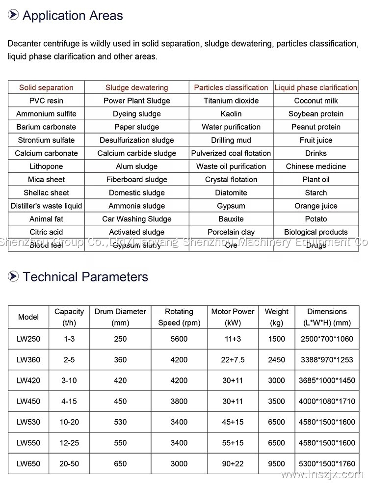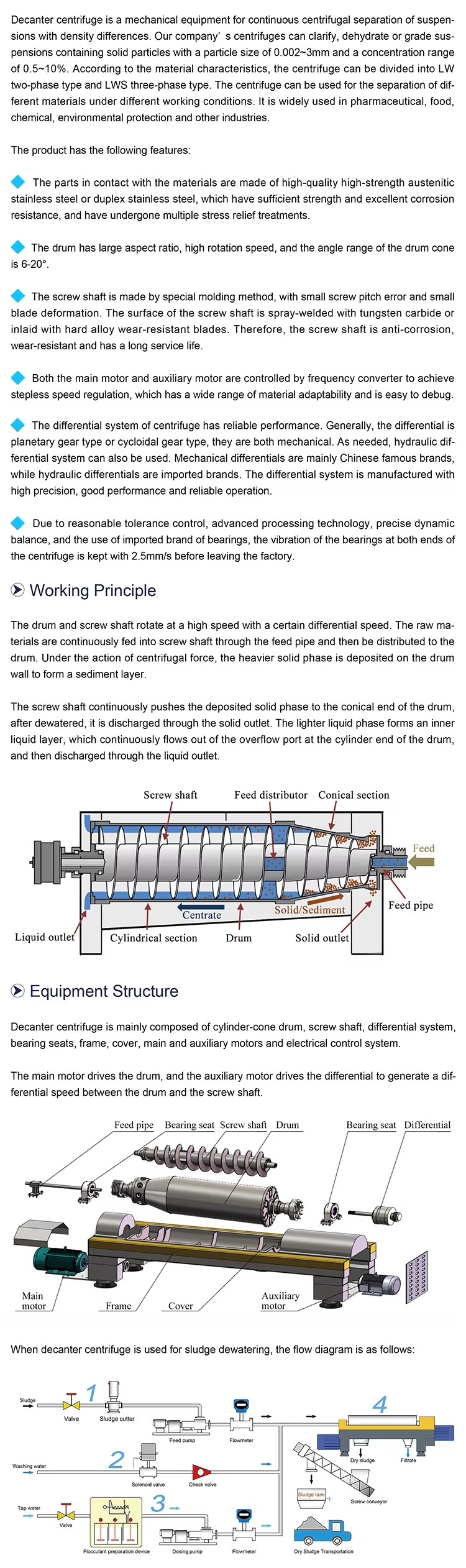 A centrífuga decantadora de parafuso horizontal é um tipo de centrífuga de decantação com descarga espiral, na qual a escória é empurrada para a porta de descarga na extremidade menor do tambor através das lâminas do empurrador espiral, e a fase líquida transborda pelo orifício de transbordamento na extremidade maior do tambor, com o objetivo de realizar a separação contínua.