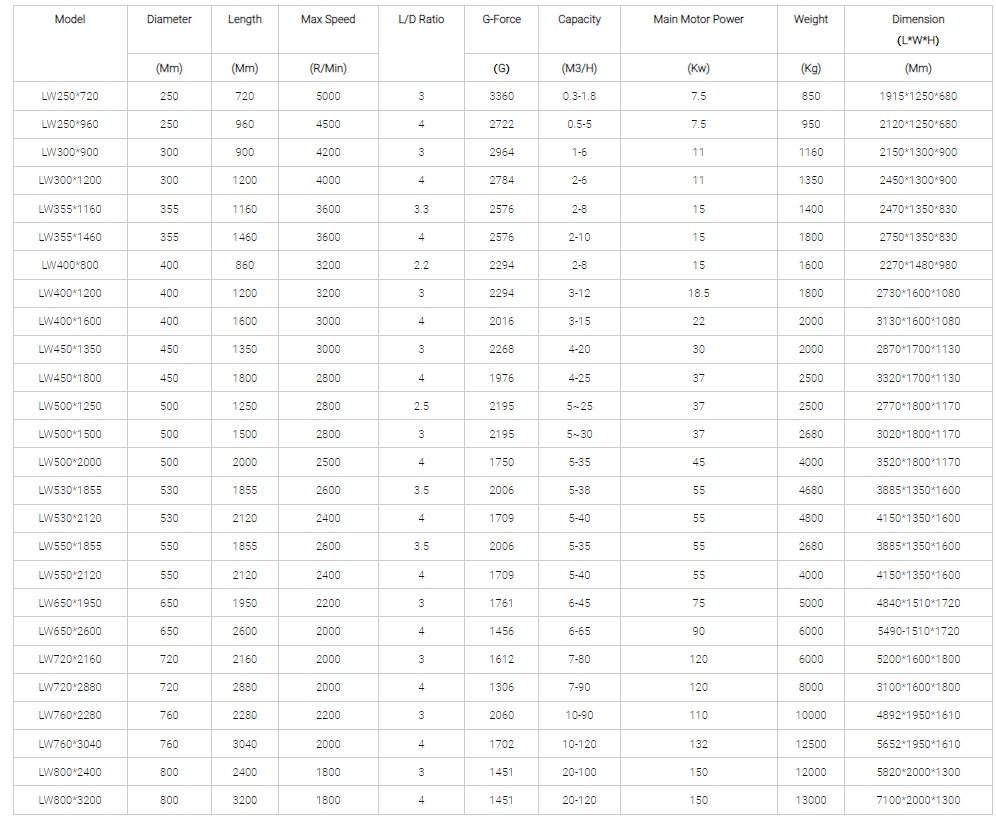 Este equipamento é um produto da série LW, comumente utilizado para desidratação e concentração. Amplamente utilizado para requisitos máximos de desidratação de lodos de águas residuais municipais e industriais. É caracterizado por tamanho pequeno, alta velocidade de rotação e pequena capacidade de processamento, e é usado em situações onde são necessários grandes fatores de separação e pequena capacidade de processamento. De acordo com a utilização prática, pode ser dividido em: tipo de clarificação, tipo de desidratação, tipo de concentração, tipo de separação, tipo de classificação, tipo de extração; Os usuários podem escolher por si próprios. A centrífuga espiral horizontal de desidratação é adequada para materiais facilmente separados com grande tamanho de partícula, grande diferença de densidade sólido-líquido, baixa viscosidade, alta concentração, forte capacidade de processamento e maior secura do que clareza. Materiais como lodo ou águas residuais contendo partículas finas geralmente requerem a adição de floculantes para condensar as partículas finas em partículas grandes, que são então desidratadas usando uma centrífuga de sedimentação.