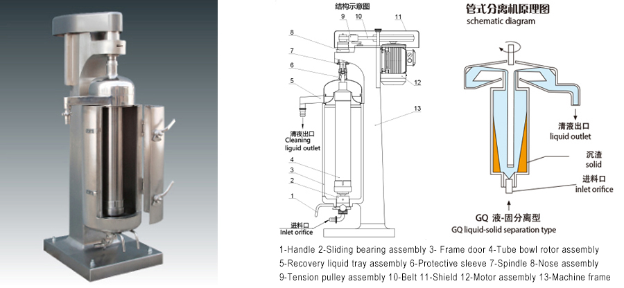 É um separador de alta velocidade. Tem melhor separação. O separador é composto por corpo principal, dispositivo de acionamento, recipiente coletor e assentos de rolamento para entrada de líquido. A parte superior da tigela é um eixo principal flexível e a parte inferior é flutuante úmida. O eixo principal é conectado à roda motriz pelo assento de acoplamento com o amortecedor. A potência é transmitida à roda acionada pelo motor através da correia de transmissão e do tensor para fazer a tigela girar em torno de seu eixo em alta velocidade e formar um forte campo de força centrífuga. O produto é pulverizado na entrada de líquido pelo fundo e o líquido é forçado a fluir para cima ao longo da parede interna da tigela e então é separado em diferentes camadas de acordo com diferentes densidades.