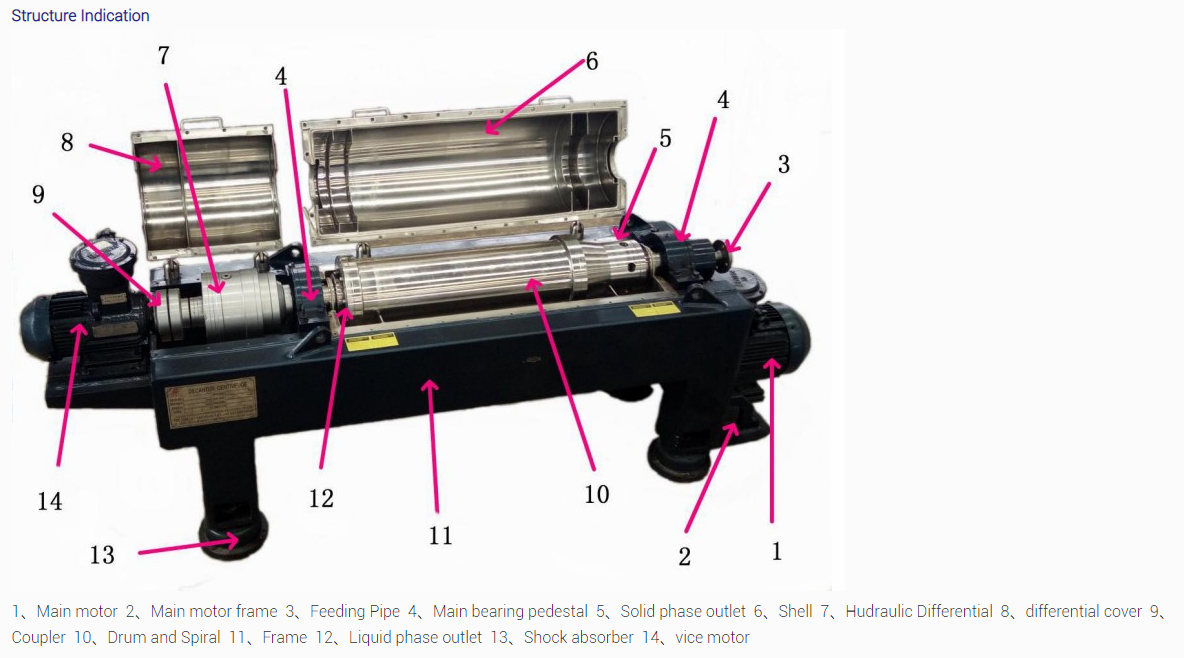 Esta máquina é uma centrífuga de descarga e sedimentação em espiral horizontal em contracorrente (centrífuga de parafuso horizontal ou desidratador centrífugo, para abreviar), e a máquina principal é composta por coluna e tambor cônico, dispositivo de descarga em espiral, diferencial, assento de rolamento, estrutura, carcaça, principal e auxiliar motores e sistema elétrico. Seu princípio de funcionamento é: a suspensão após o tubo de alimentação e a boca de descarga em espiral no tambor, sob os efeitos da força centrífuga em alta velocidade, alta proporção de partículas sólidas em fase depositadas na parede interna do tambor , o tambor para o movimento relativo da lâmina helicoidal irá continuamente de partículas sólidas em fase depositadas na raspagem da parede do tambor, o empurrador espiral de partículas sólidas em fase raspará a estrutura especialmente projetada da extrusão bidirecional.