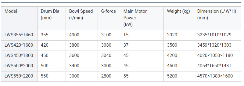 Um exemplo típico deste tipo de separação de duas fases é a desidratação de lodo da estação de esgoto municipal ou tratamento de águas residuais industriais. Nesse caso, a umidade residual nos sólidos desidratados determina os custos de descarte e a qualidade do concentrado determina a carga poluente devolvida à estação de tratamento. A minimização de ambos deve ser alcançada com o menor custo possível, com o menor consumo possível de polímero e energia, com baixos custos de manutenção e com o menor número possível de pessoal operacional necessário. Na prática, o operador rapidamente percebe que não há um ponto de operação claramente definido dadas as flutuações diárias e sazonais; alterações nas entradas do sistema ou nas configurações do processo, bem como mau funcionamento de todos os tipos, sempre apresentam novos desafios que devem ser enfrentados. A centrífuga decanter modelo LW é uma peça de equipamento de processo altamente projetada, projetada para separar sólidos insolúveis em suspensão de um líquido. A centrífuga pode ser usada para produzir uma torta relativamente seca a partir dos sólidos separados e é flexível o suficiente para lidar com uma ampla flutuação no material de alimentação e ainda alcançar excelente desempenho de clarificação e desidratação.
