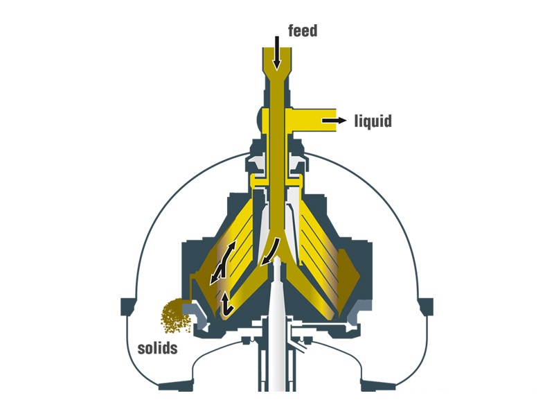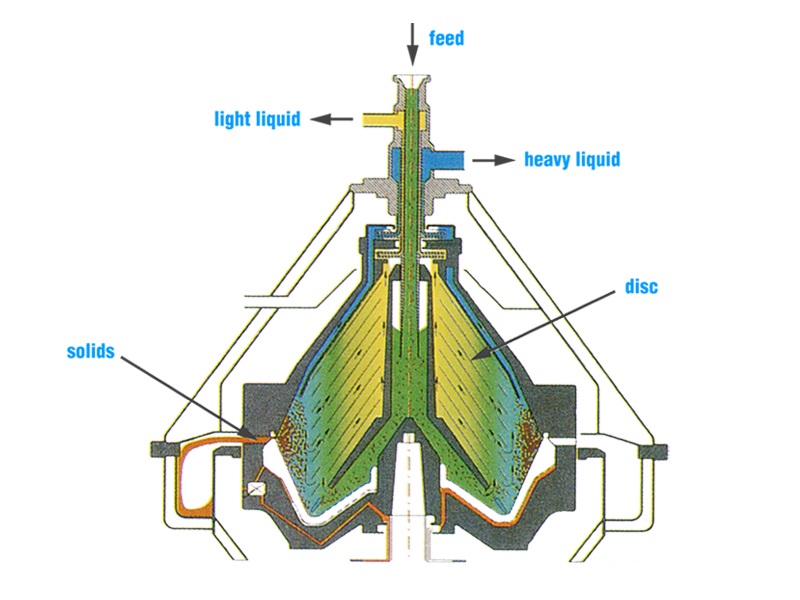 Os produtos contendo o líquido e os sólidos são introduzidos no recipiente giratório da centrífuga a partir do topo, através de um tubo de alimentação, e são acelerados em um distribuidor antes de entrar na pilha de discos. A separação ocorre entre os discos. A pilha de discos, composta por um grande número de discos colocados uns sobre os outros, divide o líquido em camadas finas, reduzindo assim a distância de sedimentação das partículas sólidas. A fase leve se move através da pilha de discos em direção ao centro do recipiente separador do bico e é descarregada sob pressão por uma bomba centrípeta integrada. As partículas sólidas pesadas são coletadas na periferia do recipiente e descarregadas continuamente através dos bicos.