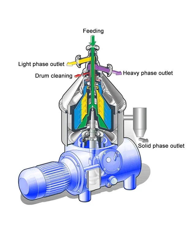 O material separado entra no coração da máquina, ou seja, no interior da tigela. Sob a ação de forte força centrífuga, o material passa por um conjunto de intervalos de separação de feixes de discos. Com os furos neutros do disco como interface, o líquido com maior gravidade específica se move ao longo da parede do disco em direção ao exterior do furo neutro, onde a escória pesada se acumula na área de sedimentos, e o líquido da fase pesada flui para cima para a bomba centrípeta; o líquido mais leve com menor gravidade específica se move ao longo da parede do disco para o orifício neutro e converge para a bomba centrífuga inferior. As fases líquidas leves e pesadas são descarregadas pela bomba centrífuga inferior e pela bomba centrípeta superior, respectivamente; a escória pesada é descarregada regularmente; a produção contínua é implementada.