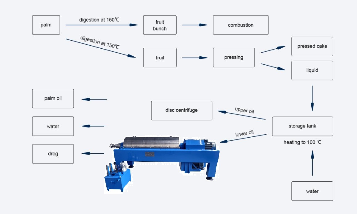 O óleo de palma é um dos óleos mais produzidos no mundo. A procura global por óleo de palma está a crescer excessivamente. O método tradicional de trituração manual para extração de óleo de palma não atende mais às necessidades do mercado de óleo de palma. O a centrífuga decantadora trifásica fornece um programa eficaz de separação e purificação para o processo de processamento de plantas de processamento de óleo de palma. Pode ajudar as fábricas de óleo de palma a processar cachos de frutos de palma frescos (FFB) em óleo de palma bruto (CPO), com características de alta eficiência e alta pureza. Simultaneamente, o equipamento pode funcionar de forma automática e contínua por um longo tempo, o que pode melhorar significativamente a eficiência de refino do óleo de palma. No processo de extração do óleo de palma, o decantador de óleo de palma é utilizado para: Processamento direto do petróleo bruto após a prensa de rosca; Recuperação de óleo de licor de cacho de fruta vazio; Recuperação de petróleo bruto do lodo do tanque CS; Recuperação de petróleo bruto do fluxo de águas residuais da fábrica de óleo de palma.