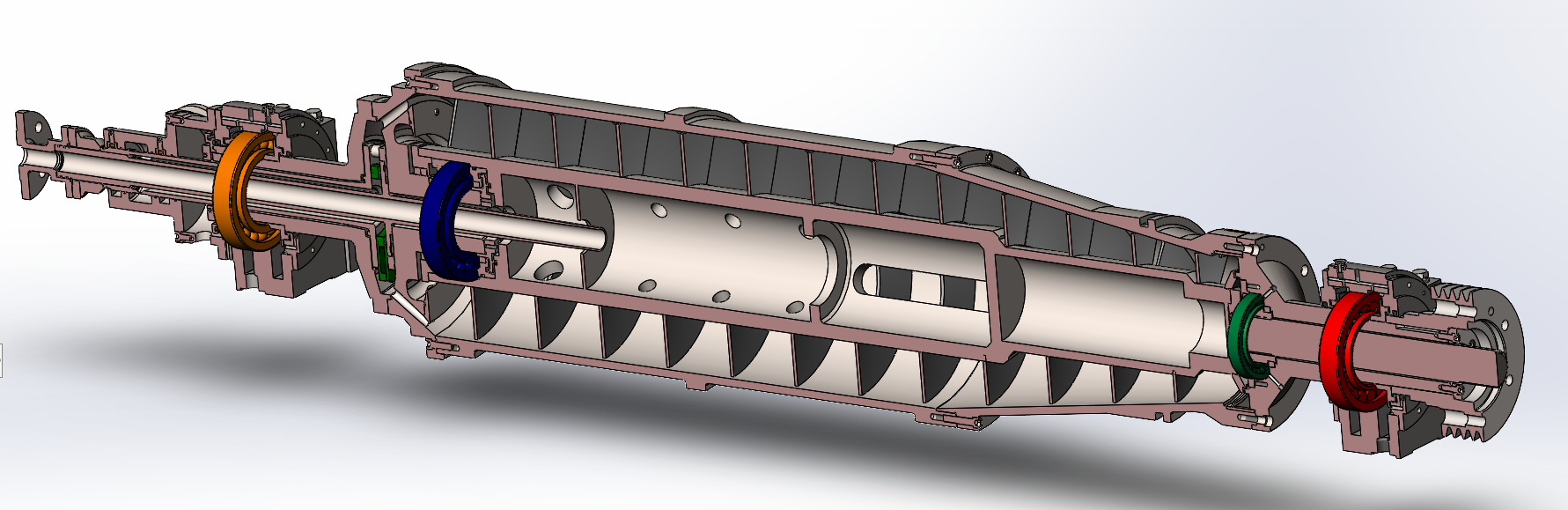 | Modelo | Diâmetro (mm) | Comprimento (mm) | Velocidade máxima (rpm) | L/D | Capacidade (m3/h) | Motor Principal (KW) | Motor auxiliar (Kw) | Dimensão (mm) |