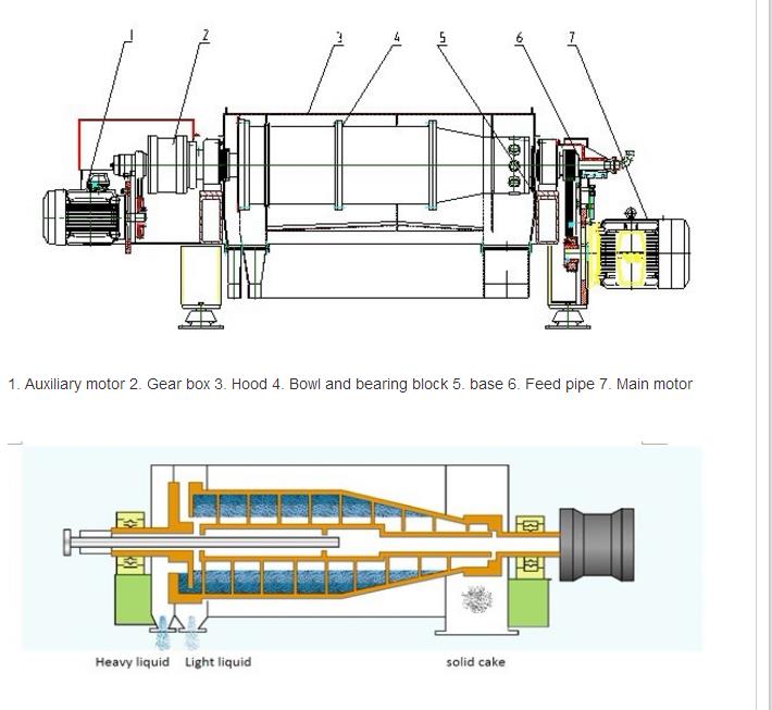 Devido à força centrífuga, as partículas mais pesadas são empurradas através do líquido e coletadas na parede interna da tigela; a rotação de alta velocidade da tigela separa os materiais sólidos e líquidos