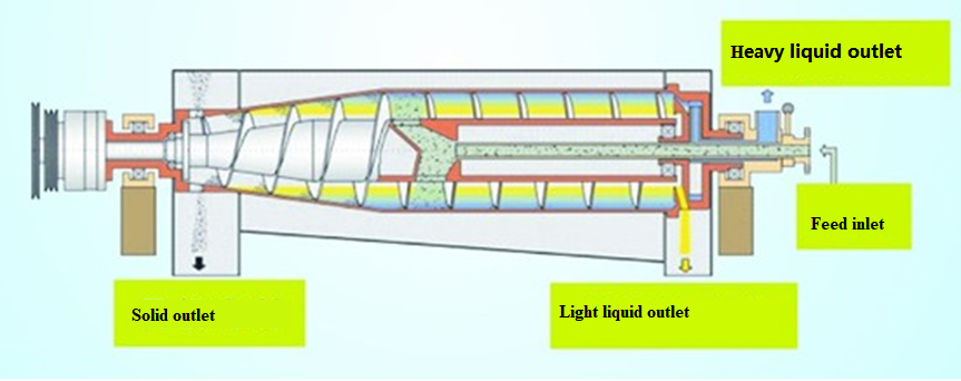 Работа трехфазной декантерной центрифуги основана на принципе седиментации, то есть твердые частицы с удельным весом жидкости осаждаются в течение заданного времени. Этот принцип можно также применить к двум несмешивающимся жидкостям с разным удельным весом. Когда материал поступает во вращающийся на высокой скорости барабан, материал вращается синхронно с барабаном. Из-за разного удельного веса центробежная сила различна. Твердые частицы с большим удельным весом подвергаются наибольшей центробежной силе, за ними следуют тяжелая фаза жидкости (например, вода) и легкая фаза жидкости (например, масло). Таким образом, центробежная сила становится меньше снаружи внутрь в соответствии с величиной центробежной силы. Образуются концентрический твердый слой и два слоя жидкости. Твердые частицы выталкиваются винтовым конвейером, а жидкости удаляются из соответствующих сопел. Таким образом, применение трехфазной декантерной центрифуги позволяет не только отделять твердые вещества в материале, но также отделять двухфазную жидкость с разным удельным весом в материале, то есть можно достичь разделения твердого тела, жидкости и жидкости.