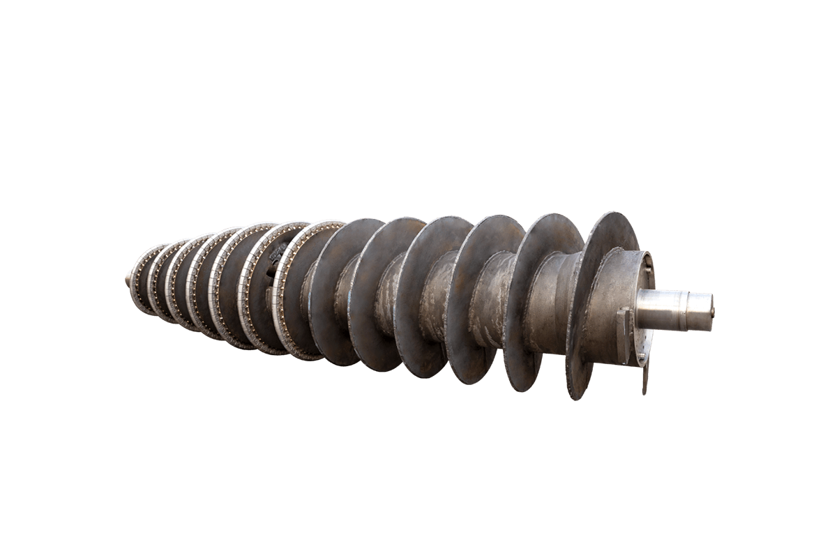 Винтовой конвейер (или шнековый) выполнен в виде архиметлиева винта. фитинг внутри пляжа и чаша между двумя концами. с небольшим зазором менее 2 мм по рациали. Он имеет ряд функций. Он не только транспортирует твердые частицы после того, как они образуют лепешку. по цилиндрической части чаши и вверх по пляжу он также принимает корм и разгоняет его до скорости чаши.
