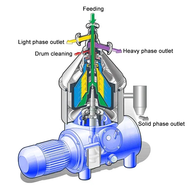 The separated material enters into the heart of the machine, that is, the inside of the bowl. Under the action of strong centrifugal force, the material passes through a set of disc bundle separation intervals. With the neutral holes of the disc as the interface, the liquid with larger specific gravity moves along the disc wall towards the outside the neutral hole, where heavy slag accumulates in the sediment area, and the heavy phase liquid flows upward to the centripetal pump; the lighter liquid with a smaller specific gravity moves along the disc wall into the neutral hole and converges to the lower centrifugal pump. The light and heavy liquid phases are discharged by the lower centrifugal pump and the upper centripetal pump respectively; the heavy slag is regularly discharged; continuous production is implemented.