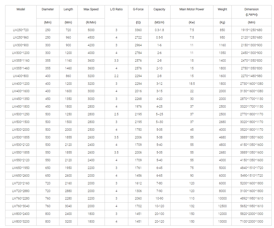 LW series decanter centrifuges usually used dewatering and thickening purpose. It is widely used for maximum dewatering requirements of municipal and industrial wastewater sludge.