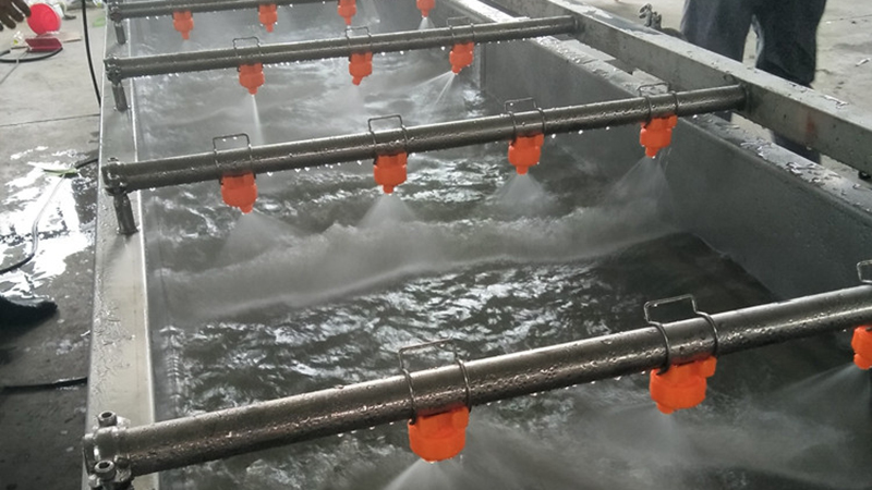 The first washing is performed by immersion in order to remove dust from the surface of the fruits. The soft water flow generated by a jet system gathers fruits by a plastic bucket elevator, which has two functions, i.e., washing fruits a second time by showering them and working as a water dripping.