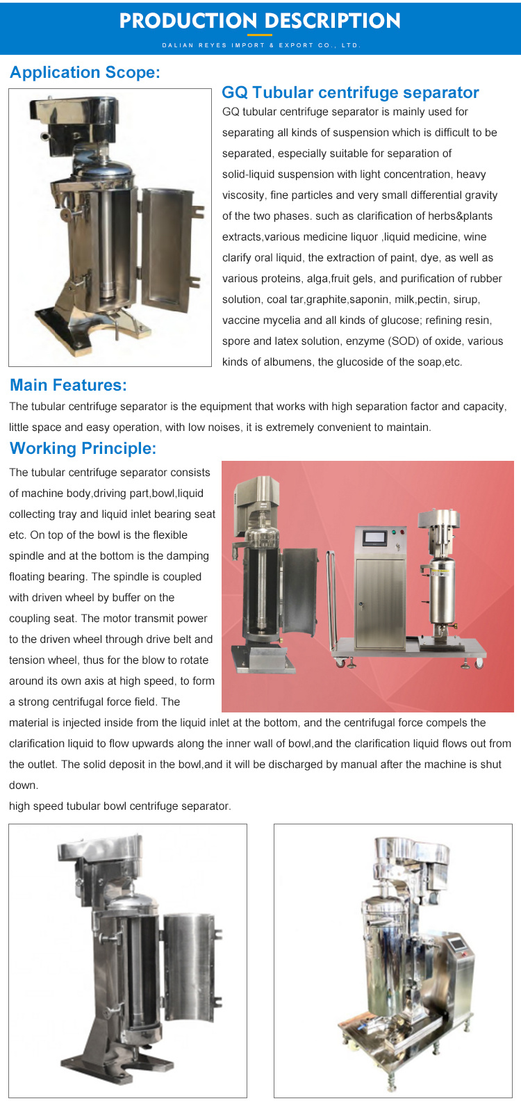 Tubular Centrifuge consists of machine body, driving part, bowl, liquid collecting tray and liquid inlet bearing seat etc. On top of the bowl is the flexible spindle and at the bottom is the damping floating bearing. The spindle is coupled with driven wheel by buffer on the coupling seat. The motor transmit power to the driven wheel through drive belt and tension wheel, thus for the blow to rotate around its own axis at high speed, to form a strong centrifugal force field. The material is injected inside from the liquid inlet at the bottom, and the centrifugal force compels the clarification liquid to flow upwards along the inner wall of bowl, and the clarification liquid flows out from the outlet. The solid deposit in the bowl and it will be discharged by manual after the machine is shut down.